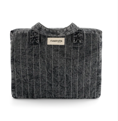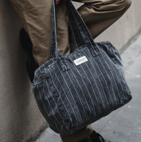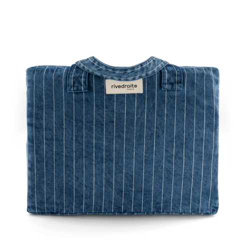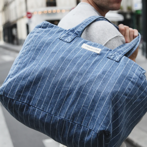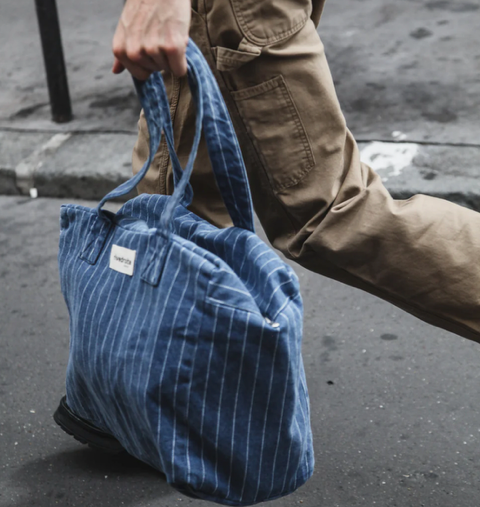 Célestins le sac 24h s’habille d’un canva de coton 50% recyclé et 50% organique. Avec ses rayures bleu marine et blanches, il s’inspire de l'iconique salopette Oshkosh.