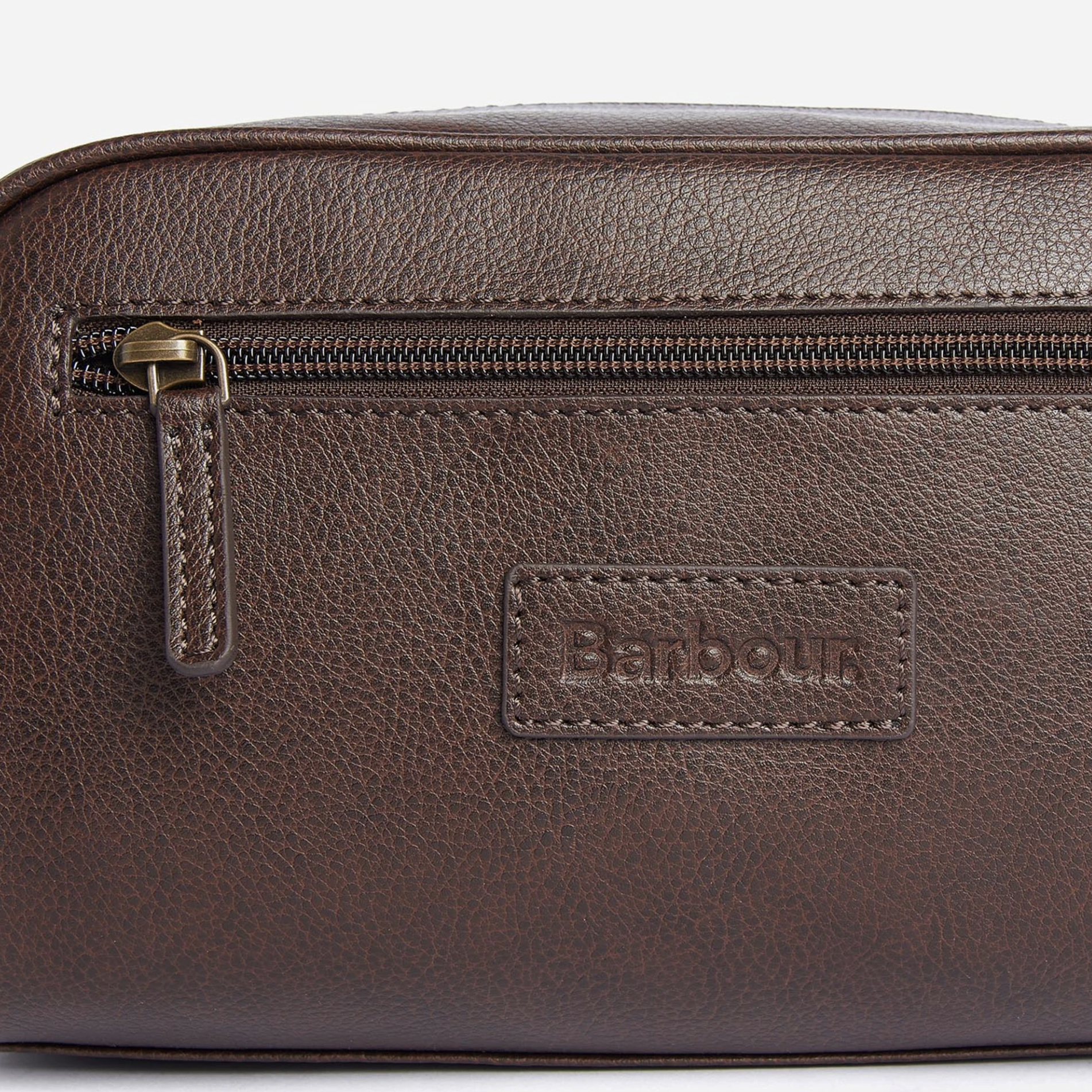 La trousse de toilette en cuir Barbour allie texture robuste et charme grâce à sa finition grainée naturelle et ses bords arrondis. Une poignée et une poche extérieure zippée complètent le look, tandis qu'un badge logo embossé sur le devant témoigne d'une attention particulière portée aux détails.