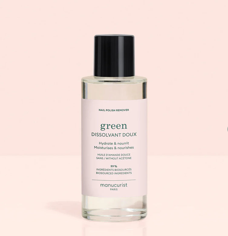 Notre dissolvant doux, bio-sourcé à 99%, retire le vernis à ongles classique Green.