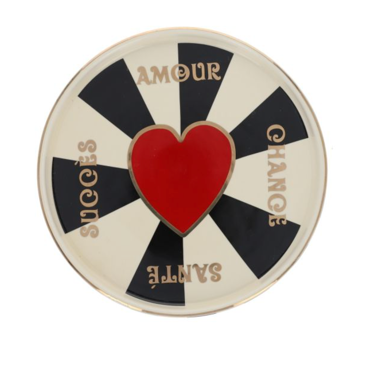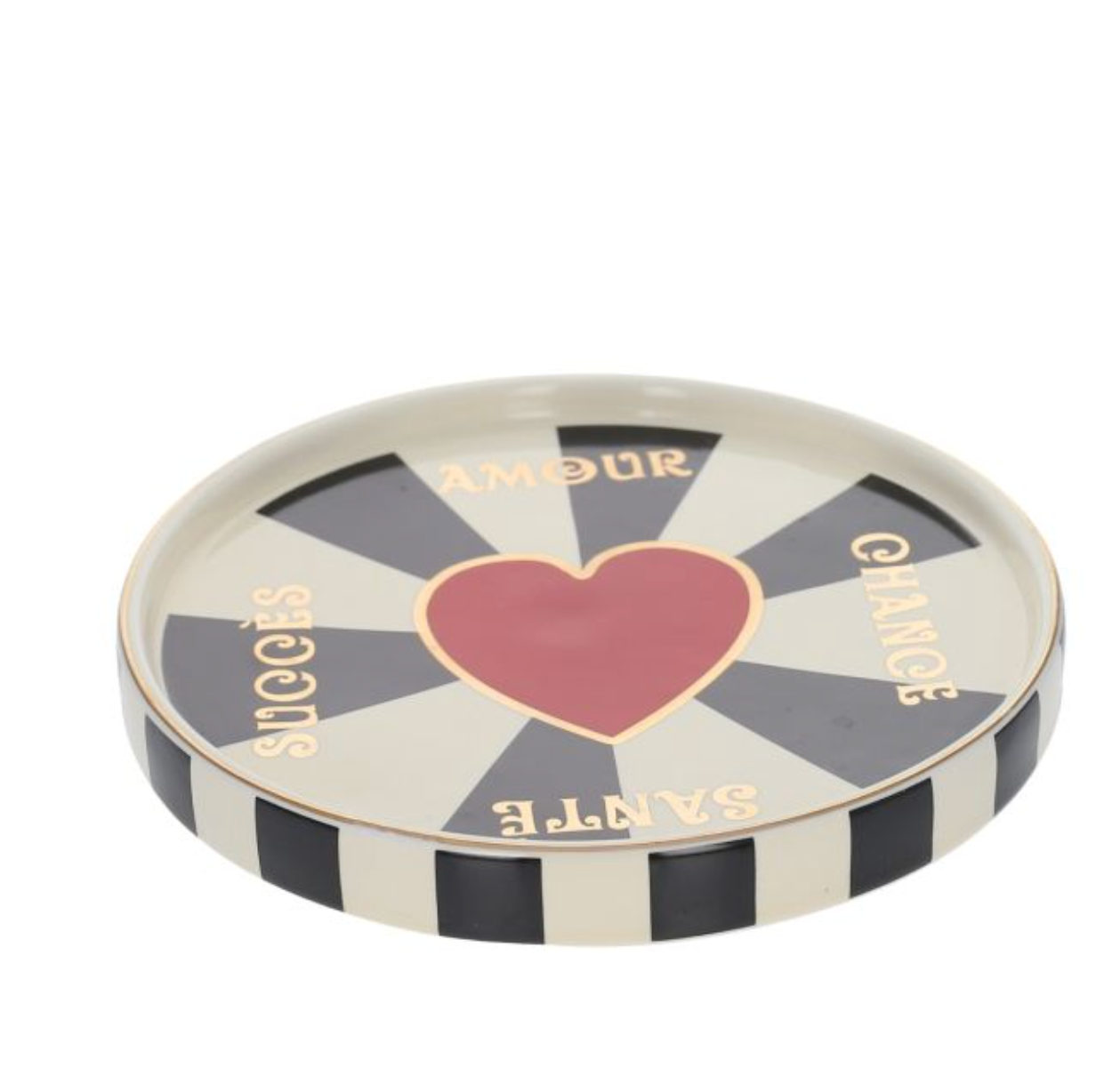 Cette élégante coupelle ronde arbore des rayures noires et blanches audacieuses, sublimées par un cœur rouge vif au centre. Tout autour, en lettres dorées raffinées, on retrouve les mots plein de bonnes énergies : “Chance”, “Succès”, “Amour” et “Santé”, formant un cercle de vœux positifs.